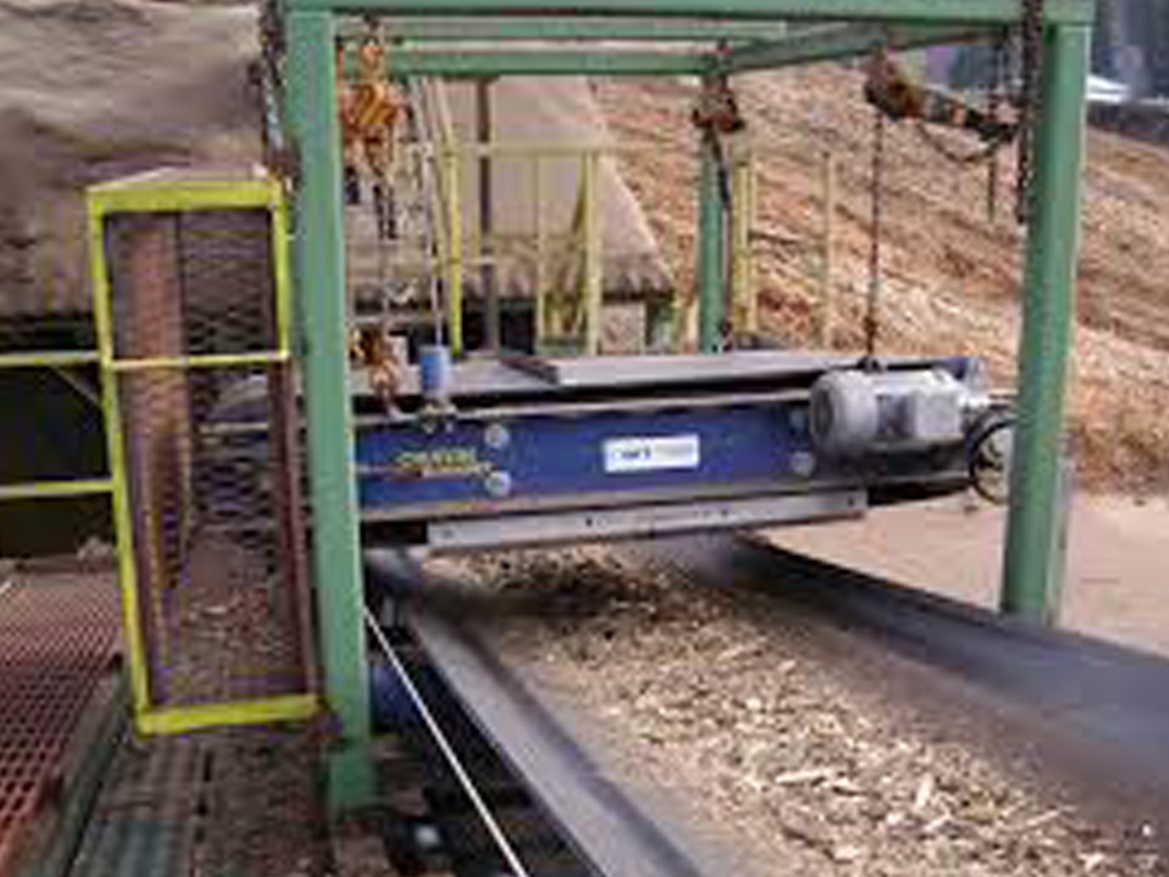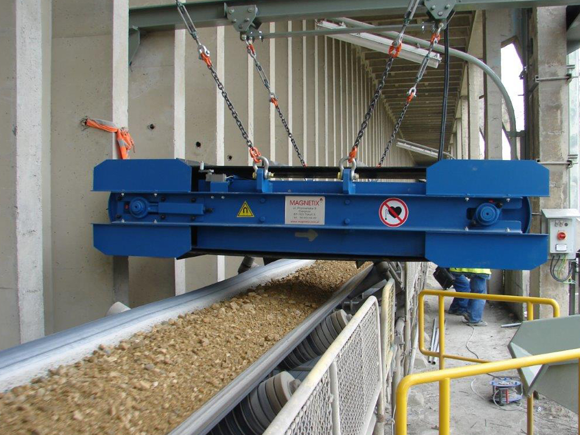 An electromagnet inside the machine attracts unwanted scrap metal from the material being conveyed; with the help of cleats, the unwanted metal is transported out of the magnetic field and discharged into a collection area.